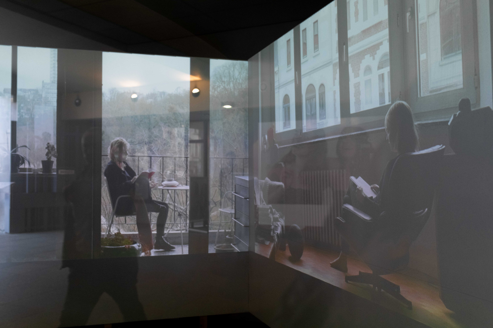Les 4 murs de la pièce, deviennent support de projection aléatoire de ces façades intérieures. Ils proposent par ailleurs aussi au visiteur de faire acte de projection. Sur l’histoire et les traces d’une occupation intérieure et sur le potentiel paysage à imaginer, celui qui se trouve de l’autre côté de la fenêtre."