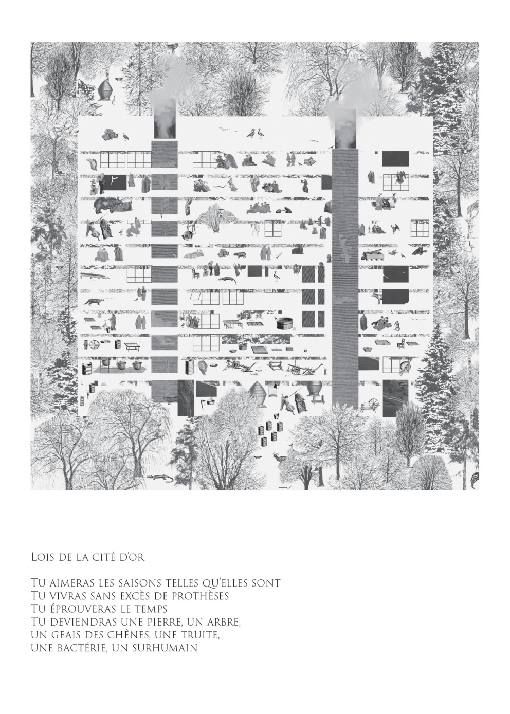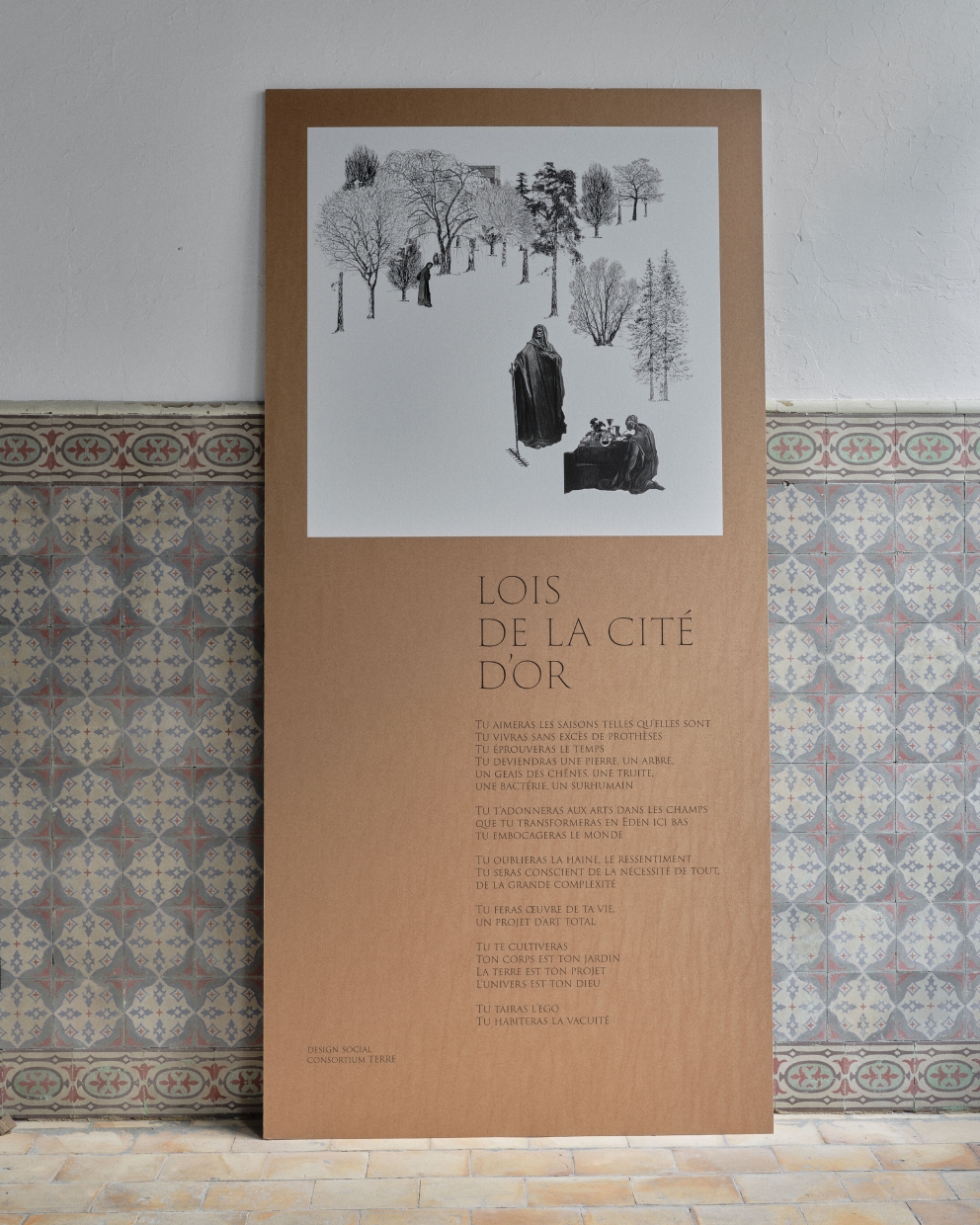 “Quel avenir dans le contexte du réchauffement climatique, de l’augmentation de la population et de la disparition des énergies fossiles? Quel design social opérer? Et enfin, quels paysages et quelles architectures pour déployer ce changement de paradigme? TERRE propose un récit fictionnel ancré dans la cité Parc à Marcinelle, une utopie visant à modeler les imaginaires afin qu’ils se préparent aux changements”.