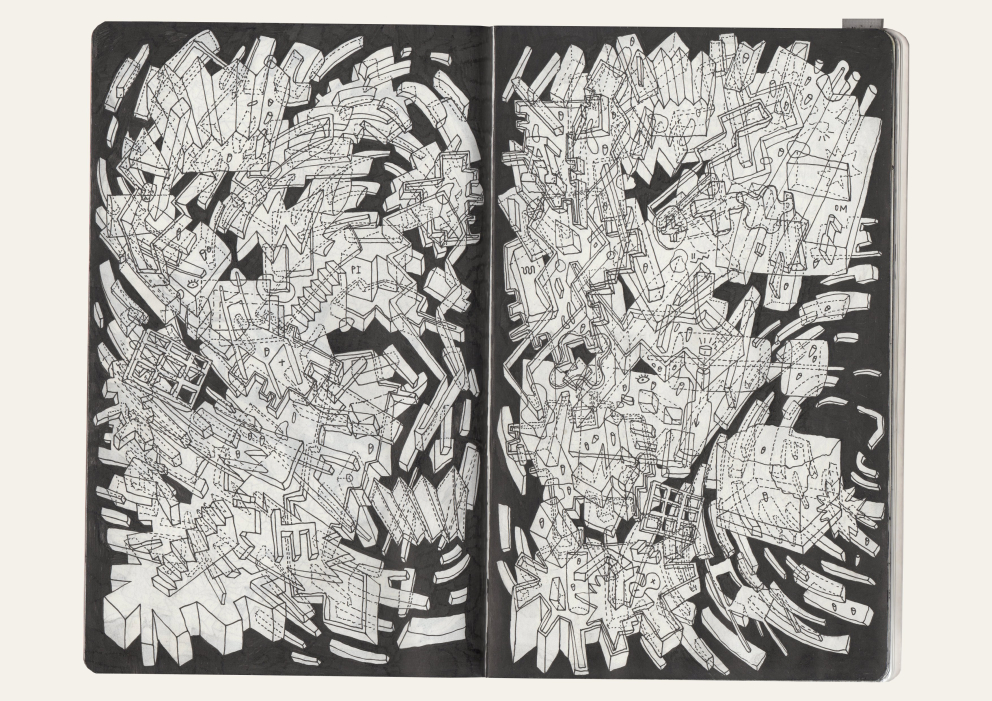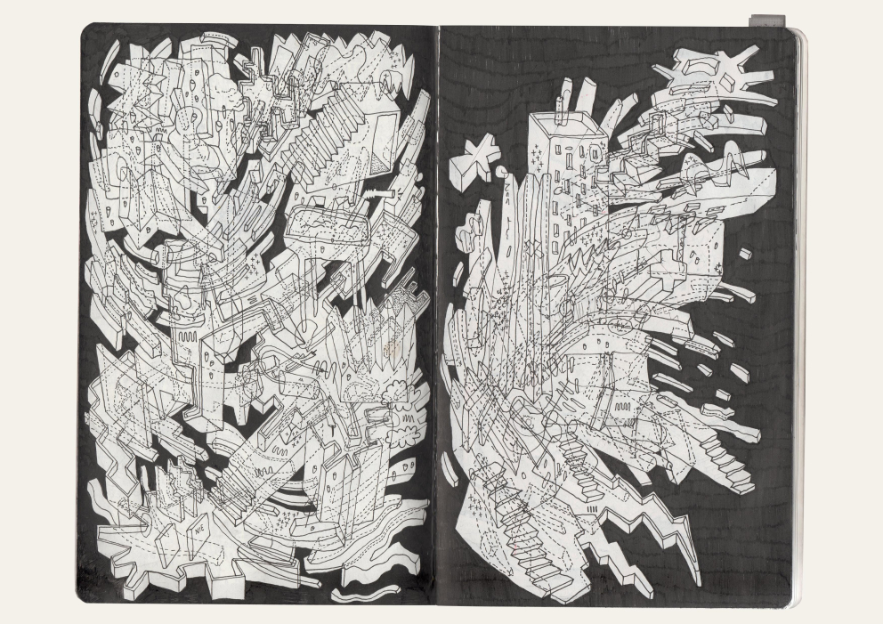 "My graphic reflection in times of crisis. The drawings are part of a vast collection of collages and sketches that capture empty urban landscapes created by architecture, everyday objects and abstract forms that create a paradoxical image: rigid, stable, fluid and evanescent."
