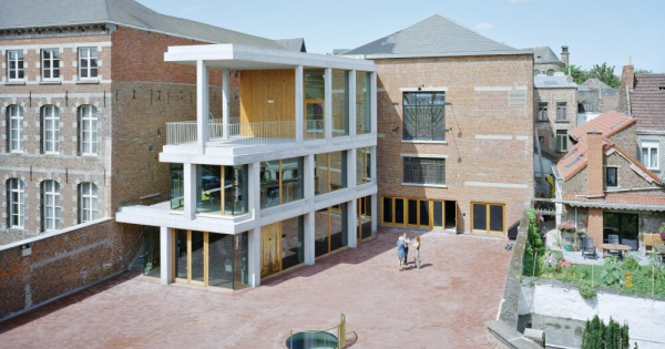 (4) La Maison Godart, conçue par André Godart en 1977, fusionne deux anciennes maisons (XVI-XVIIesiècle) en une seule entité, en y ajoutant un volume contemporain. Le projet valorise la matérialité (briques de réemploi, béton, bois), respecte la structure urbaine existante et introduit un langage architectural subtil, mêlant volumes creusés et saillants.