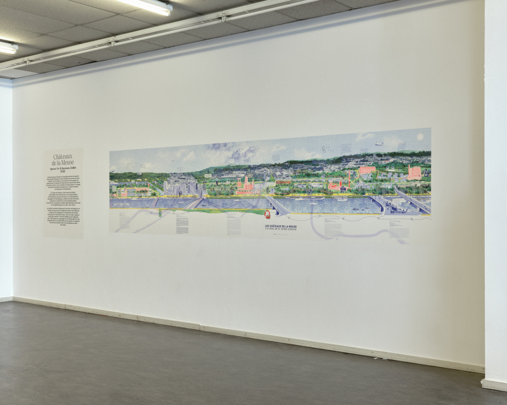 Cette fresque illustre la transformation de quatre sites sidérurgiques en bord de Meuse, ainsi que leur relation au territoire. Ce projet est l’occasion de questionner la place de l’économie industrielle dans la ville du futur, et la manière de développer un usage industriel durable, sensible aux crises sociales, climatiques, écologiques.