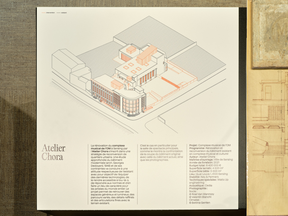 → La rénovation du complexe musical de l'OM à Seraing par l’Atelier Chora s'inscrit dans une stratégie de reconversion de quartiers urbains. Une étude approfondie du bâtiment moderniste (arch. Georges Doyard, 1948) et des contraintes va conduire à une attitude respectueuse de l’existant, humble et dénuée de toute arrogance, avec l’objectif de l’équiper des dernières technologies, de le rendre accessible à tous, de répondre aux normes et d’en faire un lieu de caractère pour les artistes du monde entier.