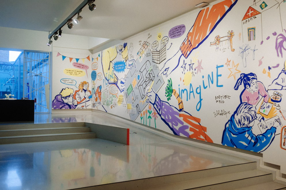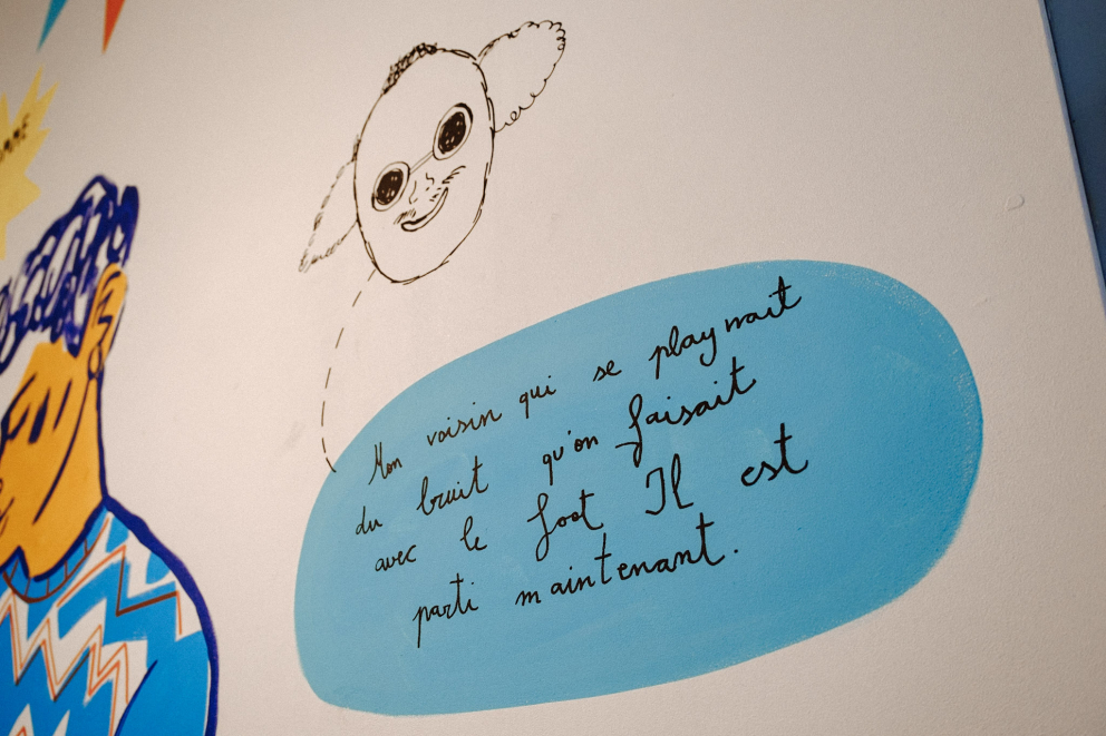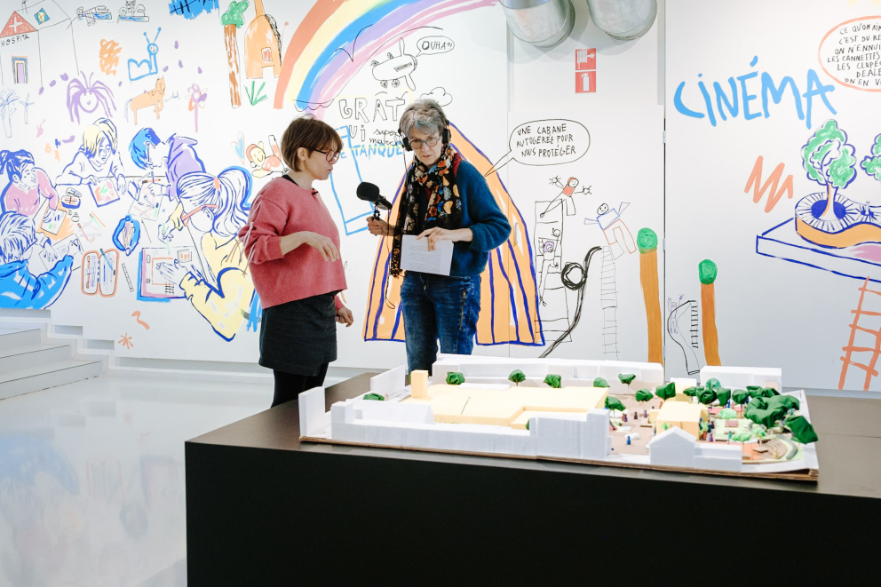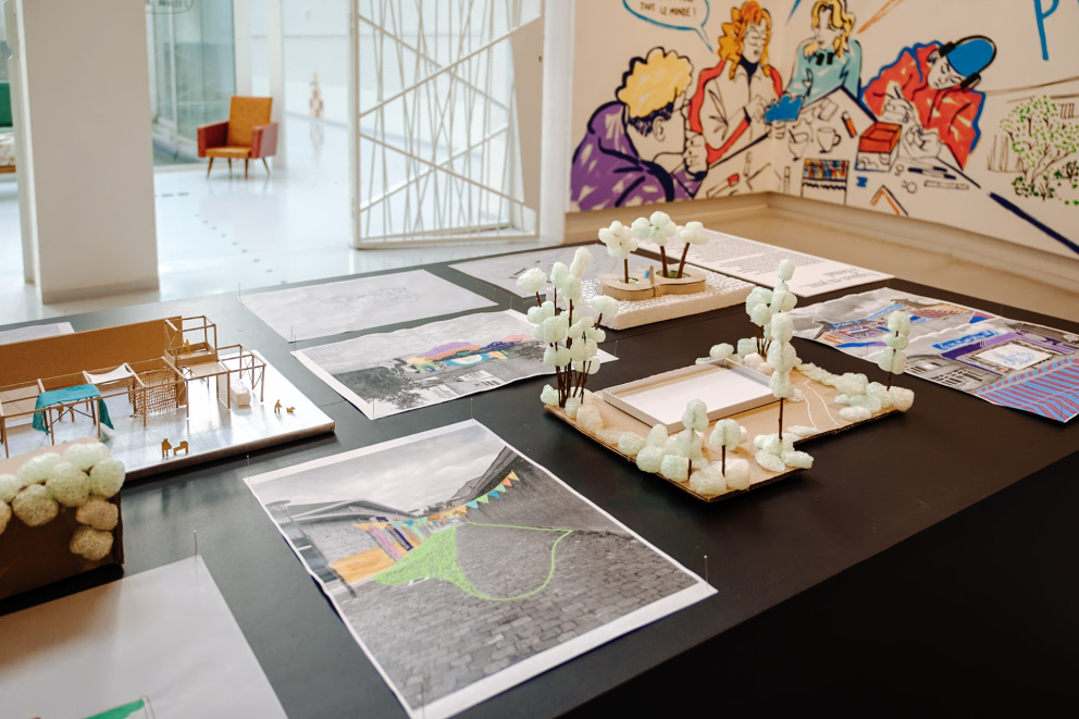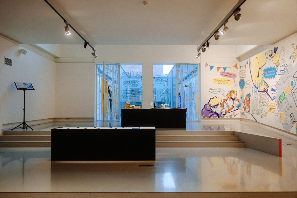 - Maquettes, photographies, films, dessins, collages et entretiens nouent un dialogue entre ces projets réalisés, des études spatiales émanant d’expert.e.s et un travail participatif citoyen mené par l’ICA et le Centre Culturel de Namur à Namur et à Temploux. Les éléments issus de ces séances de travail participatives ont été confiés à l'illustratrice Rocío Alvarez. Elle propose ainsi de créer une fresque, un dialogue illustré, entre les participants des ateliers et leurs idées pour ouvrir l’espace à Bomel.