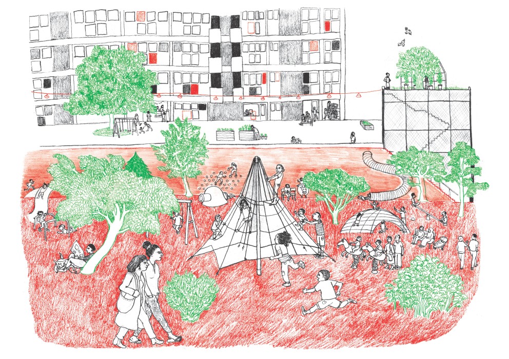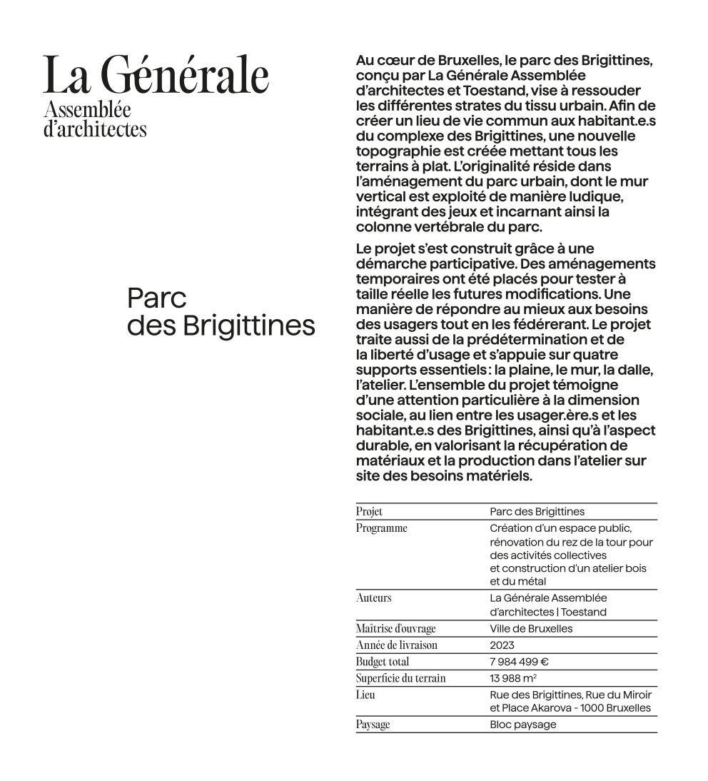 - Au cœur de Bruxelles, le parc des Brigittines, conçu par La Générale Assemblée d'architectes, s’insère dans une démarche visant à ressouder le tissu urbain. Il se compose d’interventions diverses touchant à des ouvrages existants, mais aussi à des espaces publics et de nouvelles constructions. Il offre un nouvel ensemble de ground tools et d'équipements publics pour relier et régénérer des réalités hétérogènes. Le projet traite de la prédétermination et de la liberté d'usage et s'appuie sur quatre supports essentiels : la plaine, le mur, la dalle, l’atelier. Les outils mis en place se concentrent sur les thématiques du jeu, de la fabrication et de la territorialité partagée.
