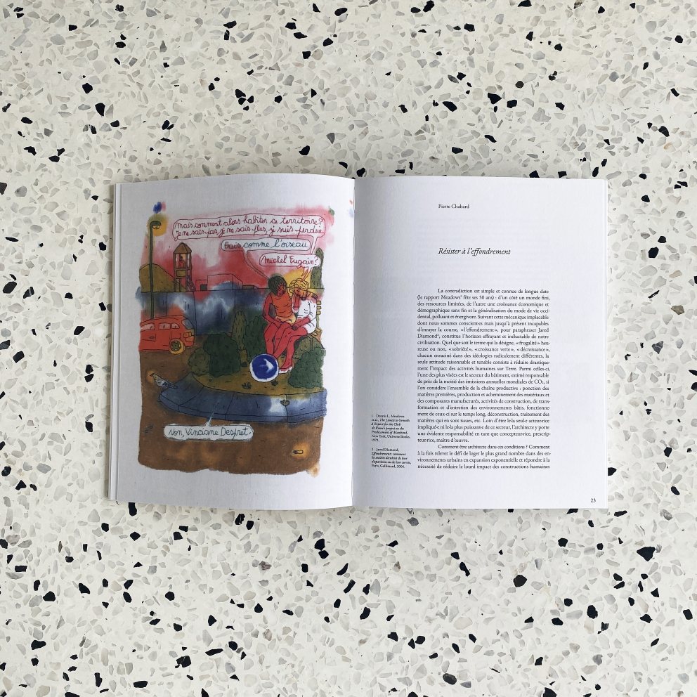 À ces réflexions s’ajoutent les libelles brodés à l’humour singulier de la plasticienne Aurélie William Levaux sur notre cadre de vie actuel ainsi que le manifeste Vers une démarche architecturale régénérative, co-signé par les membres du comité de rédaction. L’ouvrage, accompagné de l'exposition Towards a regenerative approach to architecture, ont été présentés officiellement à Venise le 17 mai 2023.